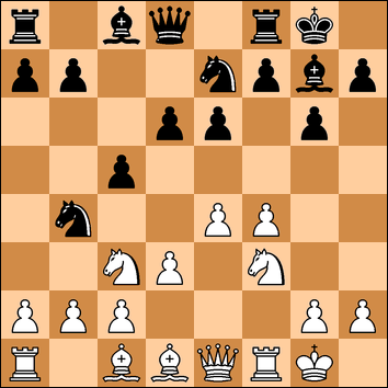 The position is now equal. White could consider a pawn sacrifice with 10. e5 Nbc6 (10. . dxe5 11. fxe5 Nbc6 12. Bg5 looks quite good) and then 11. Ne4!? dxe5 12. fxe5 Nxe5 13. Nxe5 Bxe5 14. c3 Qc7 15. Nf6+ Bxf6 16. Rxf6. For the price of a pawn, the black squared bishop has gone and White might have some play on the kingside.
